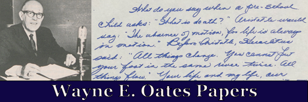 This digital collection contains the professional and personal papers, sermons, correspondence, and works compiled by Wayne Oates. Professional papers include lectures, outlines, presentations, bibliographies, research notes, and manuscripts of articles relating to the field of pastoral care and counseling.